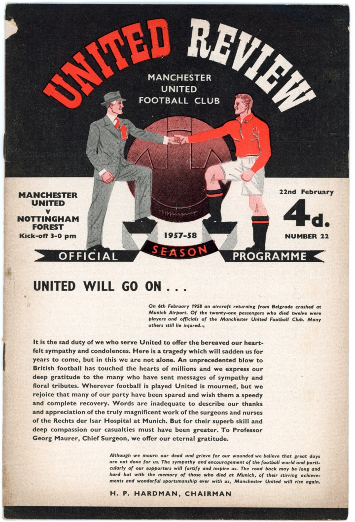 Details - Vintage Manchester United football programme from the Munich disaster season, this was the first league game back at Old Trafford for the Busby Babes after the tragic plane crash. This match would finish 1-1 with United's goal coming from Alex Dawson.