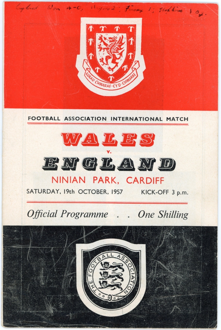 Details - Classic football progarmme, Wales vs England played at Ninian Park in Cardiff, England thrashed the Wales team that included John Charles 4-0, with Tom Finney scoring for England.